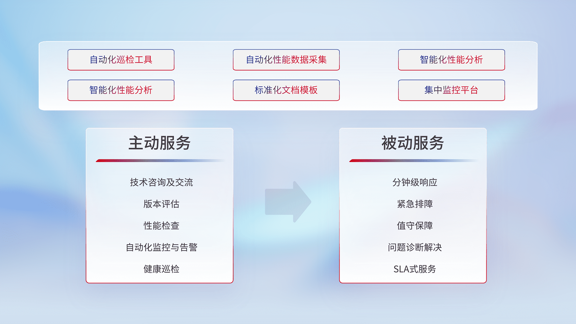 智能化工具和标准化文档,,,,保障服务质量,,,,提供主动服务(包含技术咨询、、、版本评估、、性能检查、、、自动化监控与告警、、、、健康巡检)和被动服务包含(分钟级响应、、紧急排障、、值守保障、、、问题诊断解决、、SLA服务)。。。